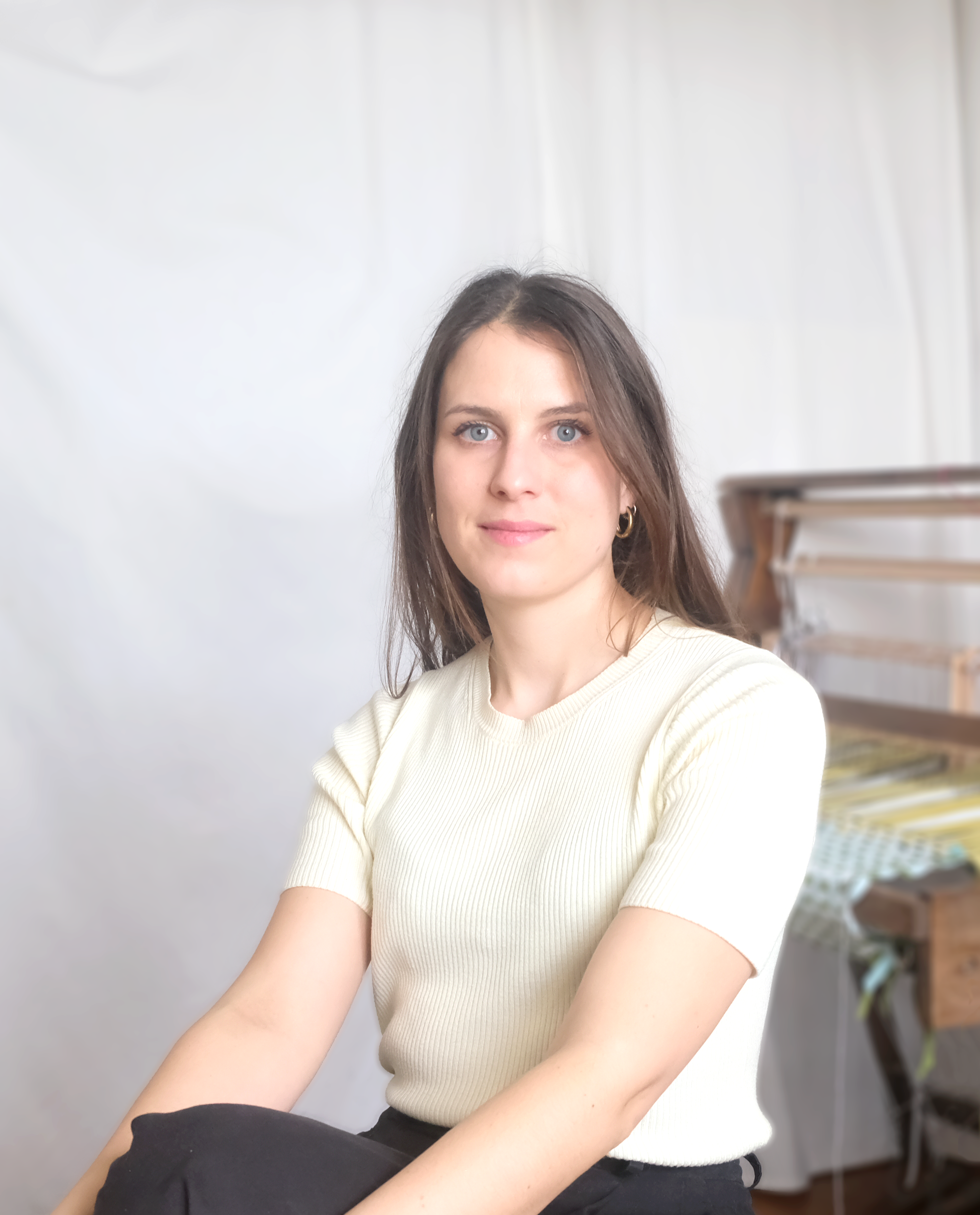 Je suis Maévane Dilé, tisserande et designer textile angevine. Je tisse depuis mes études en design textile, à l’issue desquelles j’ai évolué dans le milieu industriel. Cette expérience a profondément structuré ma pratique, aujourd’hui située à la croisée des métiers d’art et de l’industrie, avec le tissage comme langage commun. Je crée des pièces uniques et développe des projets sur-mesure en tissage à la main, tout en concevant des modèles de tissage destinés à l’industrie. Mes recherches explorent les reliefs, les vibrations chromatiques, les rythmes et les perspectives, nourries par l’observation des structures et des rythmes architecturaux. Issue des constats faits en milieu industriel, ma démarche s’ancre dans le réemploi : le tissage devient un espace créatif pour faire émerger des solutions de revalorisation des matériaux. Les matières naturelles et la recherche chromatique autour de l’indigo sont au cœur de mon processus, nourries par des voyages et des apprentissages, notamment au Japon.